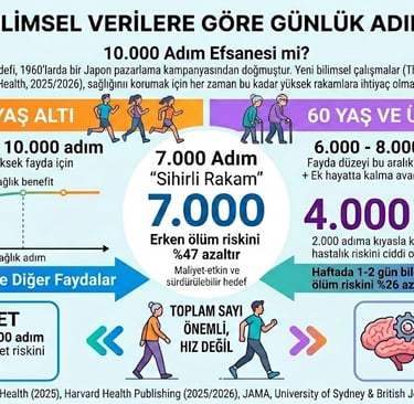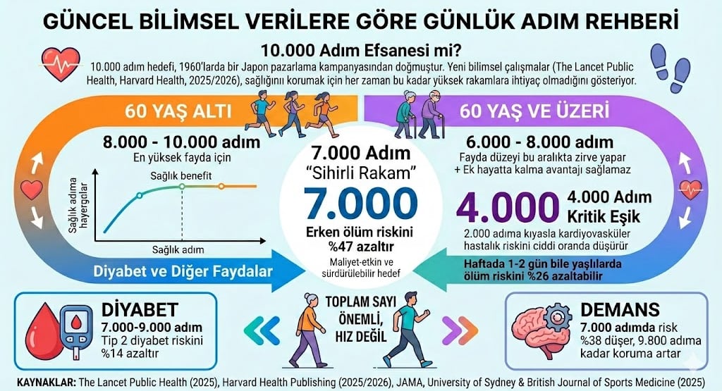 "10.000 adım" hedefi, aslında 1960’larda bir Japon pazarlama kampanyasından doğmuş bir şehir efsanesidir. 2025 ve 2026 yıllarında yayınlanan kapsamlı bilimsel çalışmalar (özellikle The Lancet Public Health ve Harvard Health verileri), sağlığınızı korumak için bu kadar yüksek rakamlara her zaman ihtiyaç olmadığını gösteriyor.